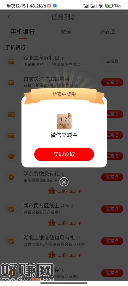 工商银行APP,任务中心,湖北工享好礼日,刚中1.22