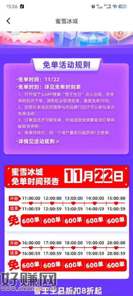 今天蜜雪也有免单,不知道是否冲突免单名额,饿了么搜雪王生日进活动页面