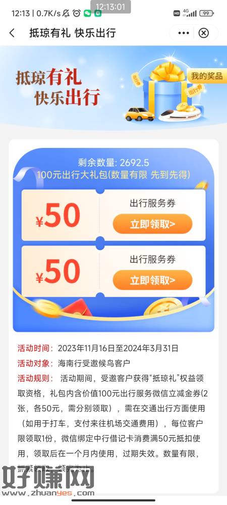 全网首发 中行海南 生活——为您优选——候鸟专区——抵琼有礼 两张50出行服务券 深圳通可抵扣 我也不是特邀 能领