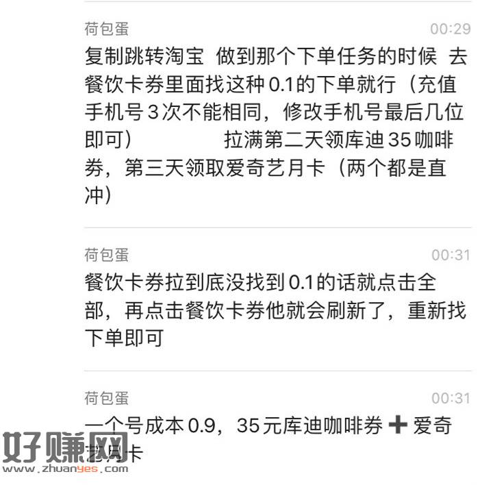 淘宝搜惠生活点卡劵购买三张0.1不同号码。两天酷迪咖啡,三天爱奇艺月卡,多号自己毕业