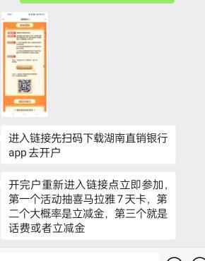 湖南银行直销银行公众号app去抽奖 他立减金 得有湖南直销银行一类卡 没有的话 你可以出售 对付撸把 个人感觉在湖南的去比较合适 可以中20块钱话费,自己用