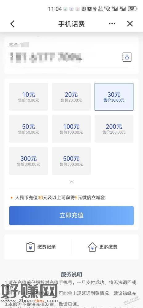 建行生活充话费30送5立减金,可能地区,没详细规则,自测