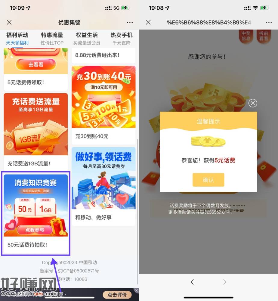 【移动知识答题抽5~50元话费】微信打开地址->消费知识竞赛->简单答对6题以上抽5~50元话费,奖励将于2月份发放