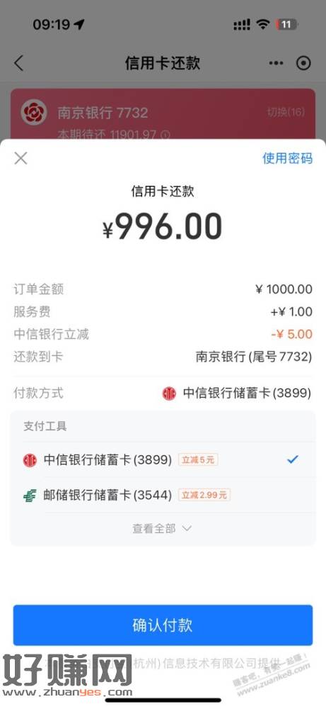 支付婊xing/用卡还款中信1000-5