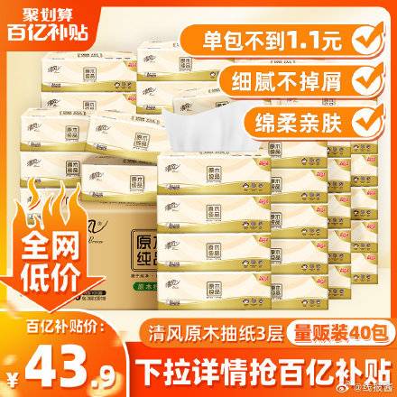 百亿补贴,43.9亓 ,清风原木抽纸100抽*40包