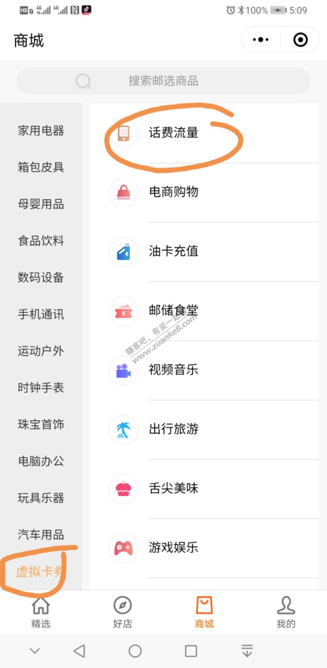 话费交换路径:公众号-我的-邮选权益-商城-虚拟卡券-话费流量
