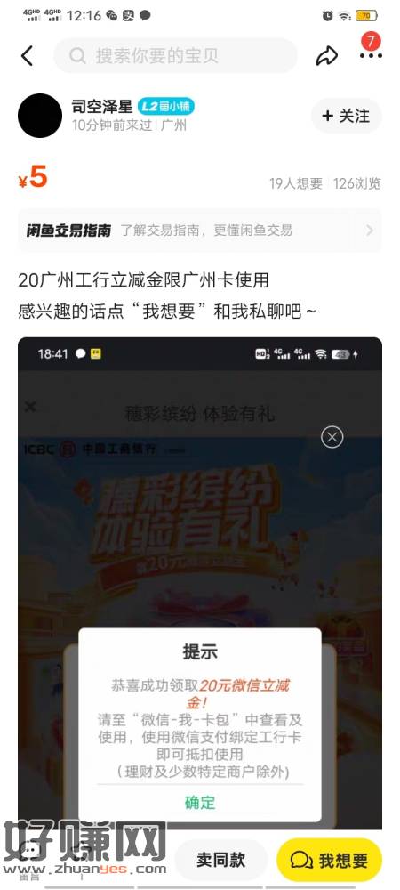 昨天这个兄弟分享了除广州和深圳的工行立减金,现在我分享广州的。在闲鱼上找到这个,因为最便宜,只需要5元可兑20。广州的一类实体卡或者二类电子户都行,还需要5个能接到验证码的号码,号码是不是自己实名的无所谓。我不知道现在✈️广州行不行,怕的不要试。