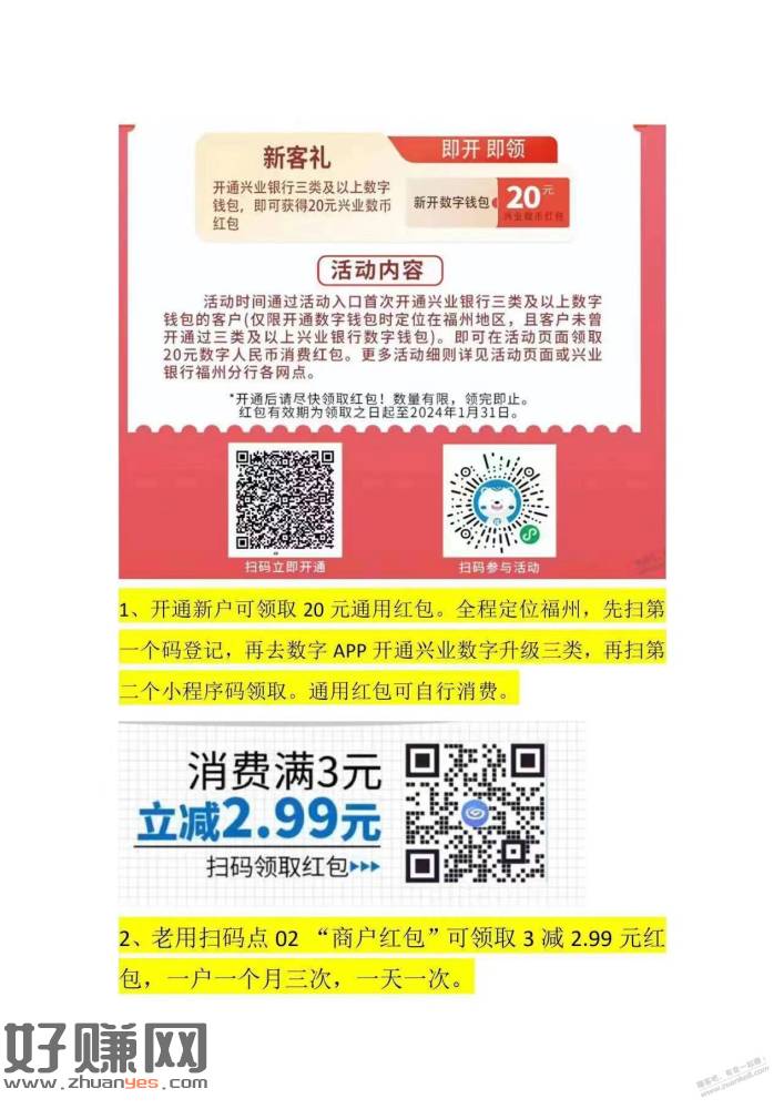 定位福州开通兴业银行数字20通用,老用户每天领3红包
