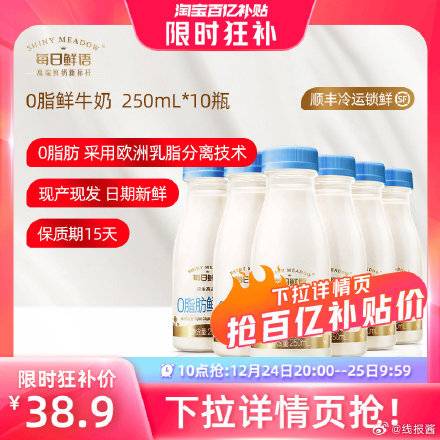 百亿补贴38.9亓, ,每日鲜语0脂鲜奶250mlx10瓶