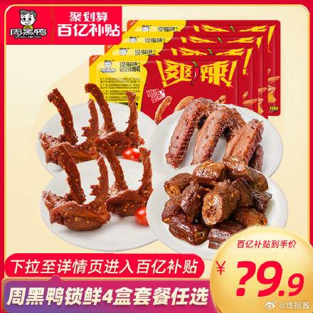 百亿补贴39.9,折9.9/盒 ,周黑鸭多款鸭货组合四盒