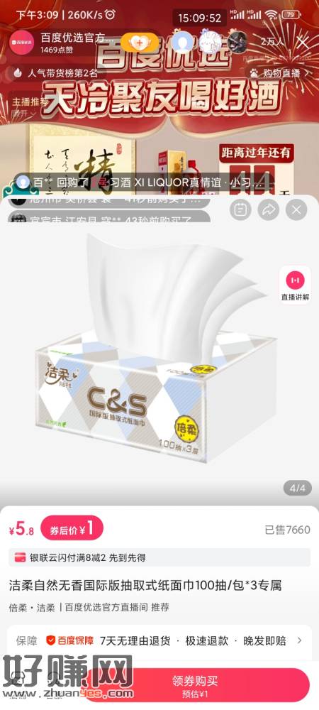 [ [ 百度直播 ]今日限时福利1元3包洁柔抽纸,还有超多大牌酒水