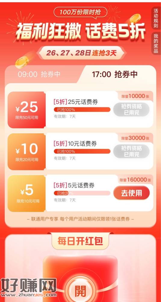 中国联通app首页横幅抢券.5冲10话费,速撸