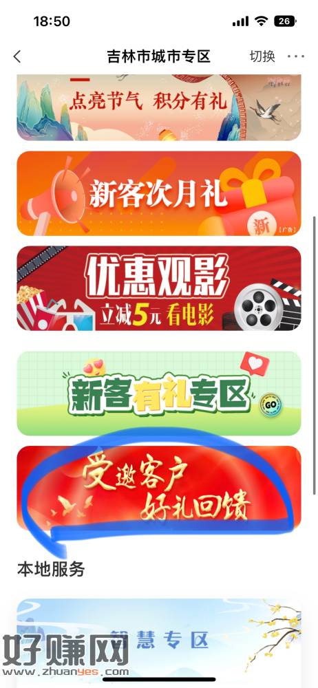 农行城市专区,手动改到吉林市,点击“受邀客户好礼回馈”参与“