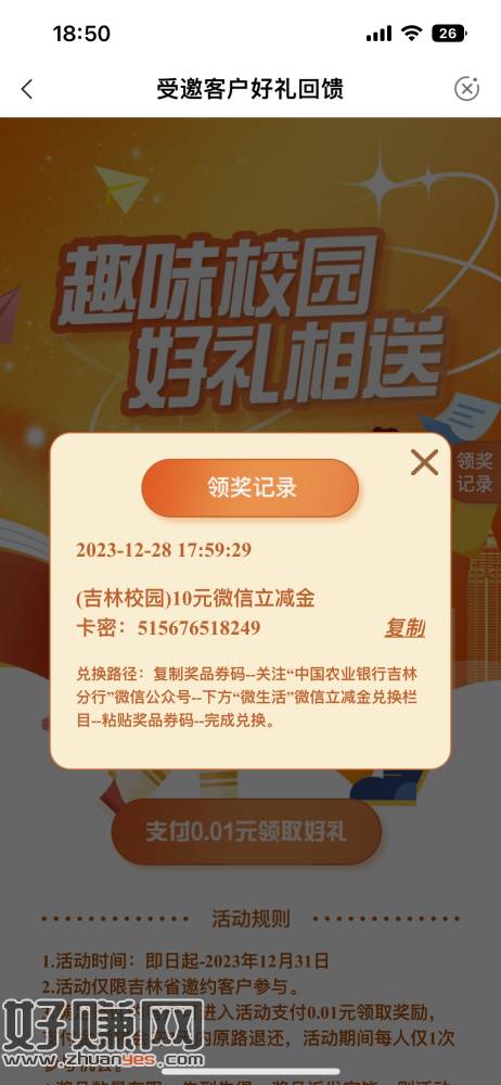农行城市专区,手动改到吉林市,点击“受邀客户好礼回馈”参与“趣味校园好礼相送”活动,部分人可以直接领,不用