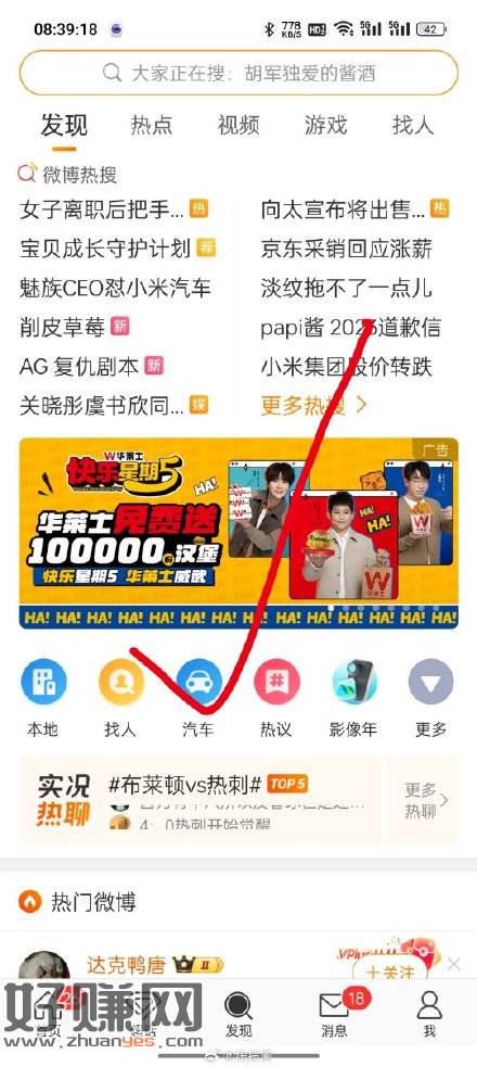 微博点发现,如有有免单汉堡,要是看不见广告,多进几