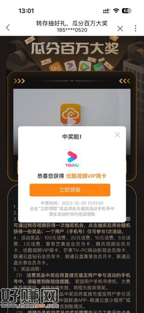 联通APP,中了优酷月卡