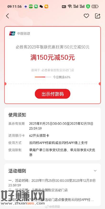 云闪付搜必胜客,今天有150-50,具体规则自己看一下