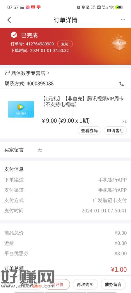 1元购实物或者腾讯视频周卡