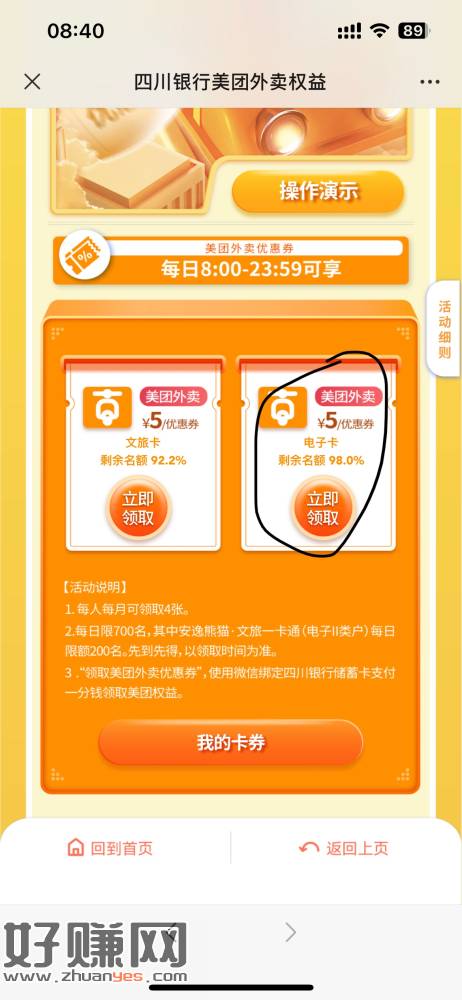 四川银行有卡的看得上的去0.01买美团5,每月四次