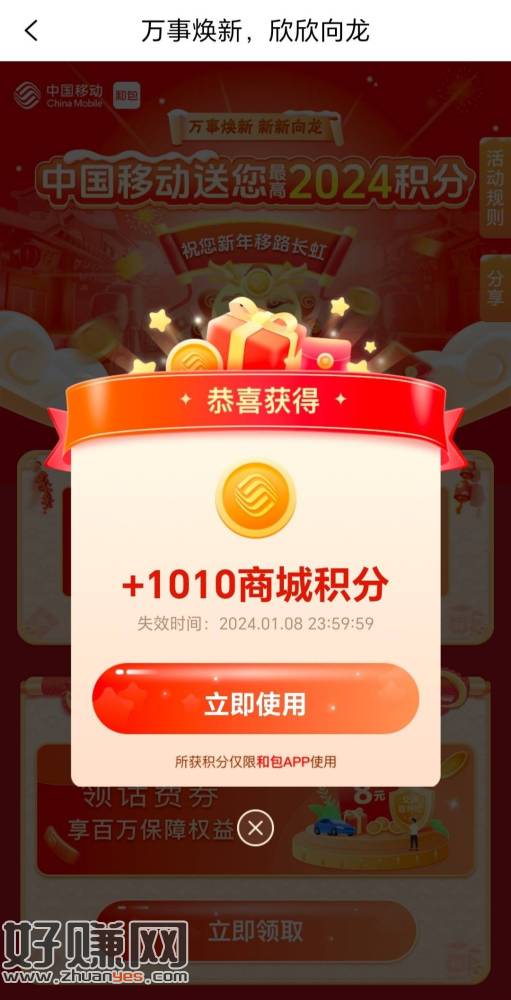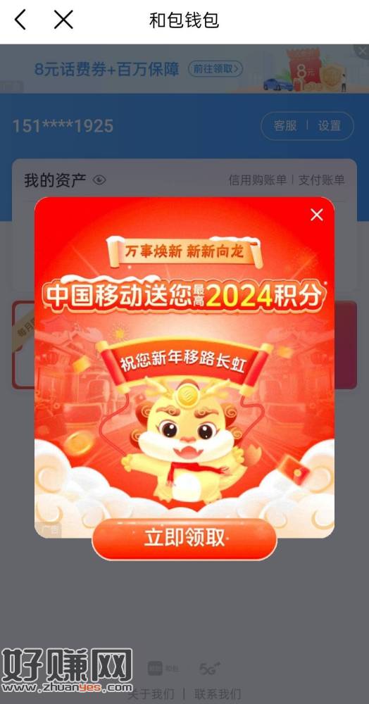 最高2024和包积分!中国移动app首页搜和包钱包,直接点进去,会弹窗出来一个领积分活动,速去!
