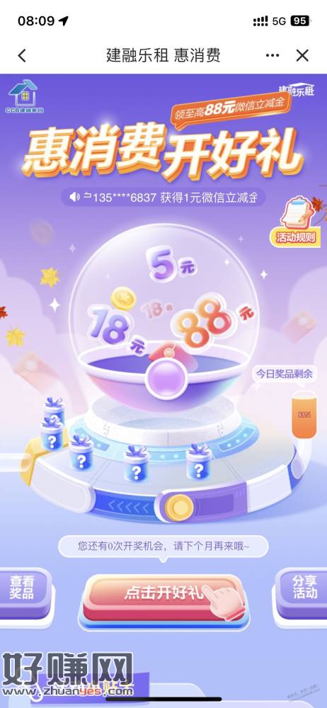 建行app搜:建融家园,顶上,抽立减金,每月1次,我刚才抽到5