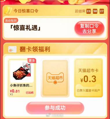 今日口令【惊喜礼遇】,可翻猫超卡和1分钱带走实物商品!