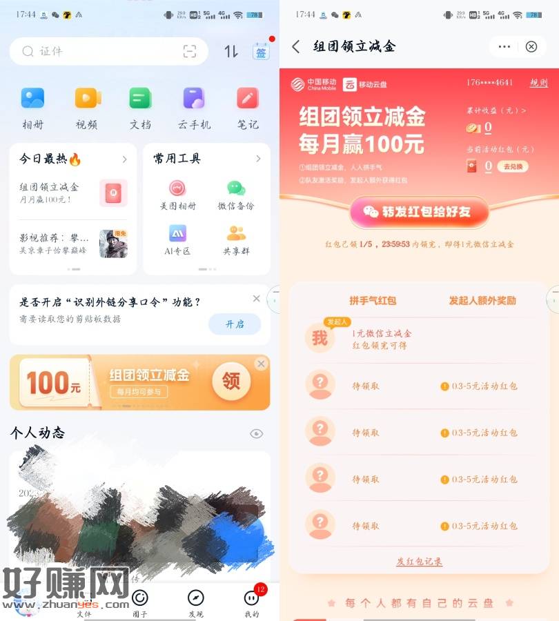 移动云盘APP->横幅“组团领立减金”->邀请4位好友组团,