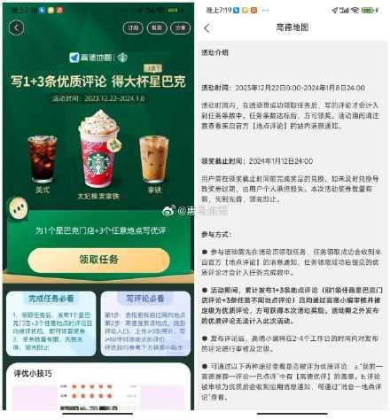 【高德地图写优质评论领大杯星巴】高德地图APP->搜索“星巴克赏金”->领取任务写优质评论->需要4条评论评优才可领取(审核2~4天才会定级)->想参与的可以试试看!
