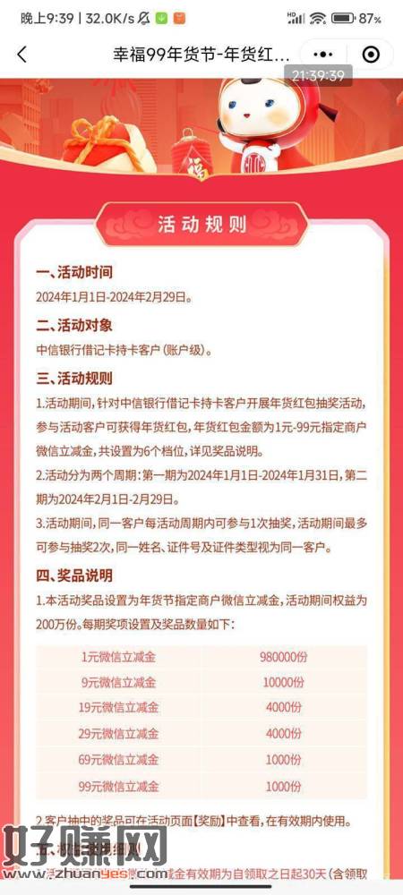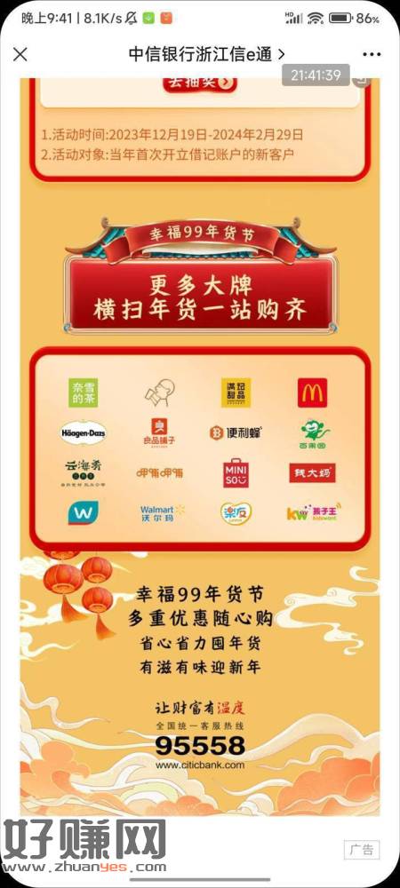 信幸福99年货节活动在中信银行浙江信e通29号推文,抽奖最高99,好运的去,能百果园麦当劳啥的