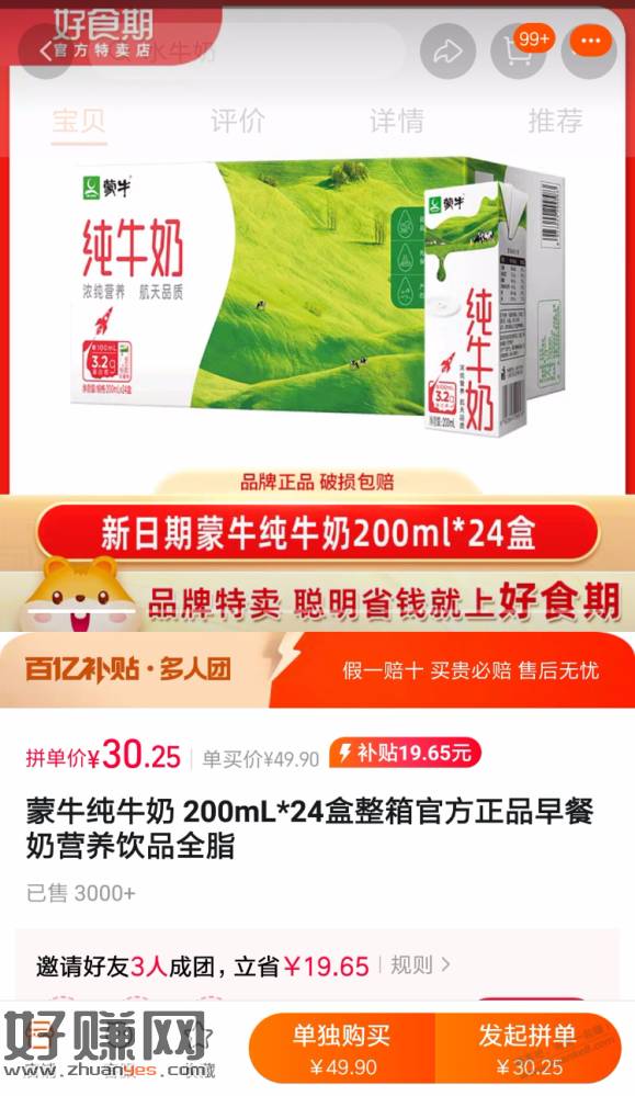 蒙牛纯牛奶 200mL*24盒整箱单件27包邮