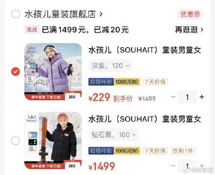 用刚刚1000-80plus券 ,228 水孩儿羽绒服