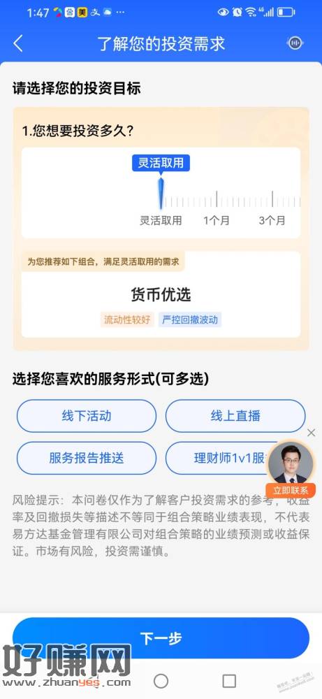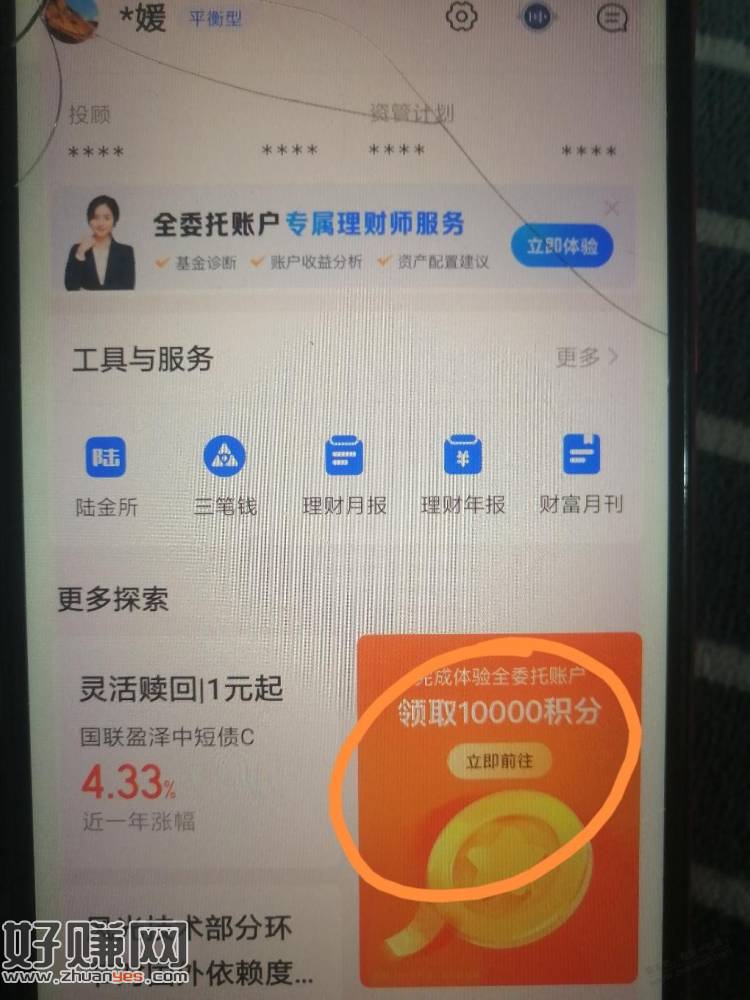 现改名 陆基金app,我的,右下 滚动 10000积分,点进去,首次全委托账户购买基金(买货基或货基 债基),投资目标测评时选收益率低灵活性的。基金确认后1万积分可兑大约20京东E卡或其他东西。