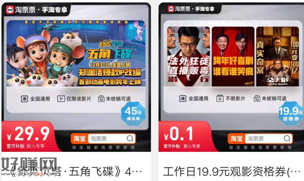 淘宝搜店铺,淘票票新人30元可购买两张特价票,润15+