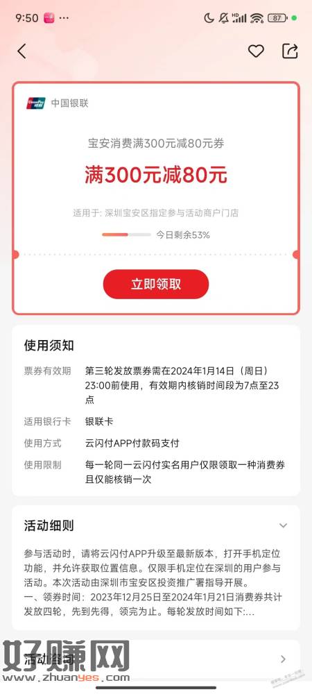 云闪付搜 宝安消费满300元减80元券 求加果果