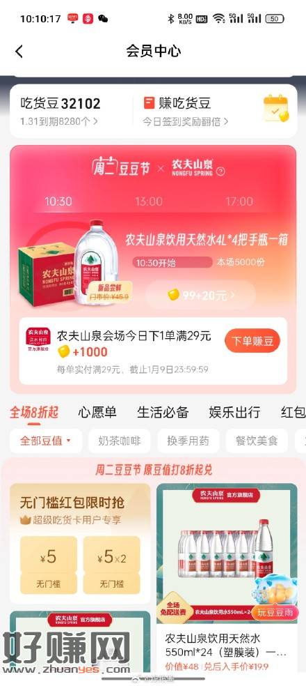 饿了么吃货豆,10点30,13点,17点,有99豆+20兑换农夫山泉,感觉不划算