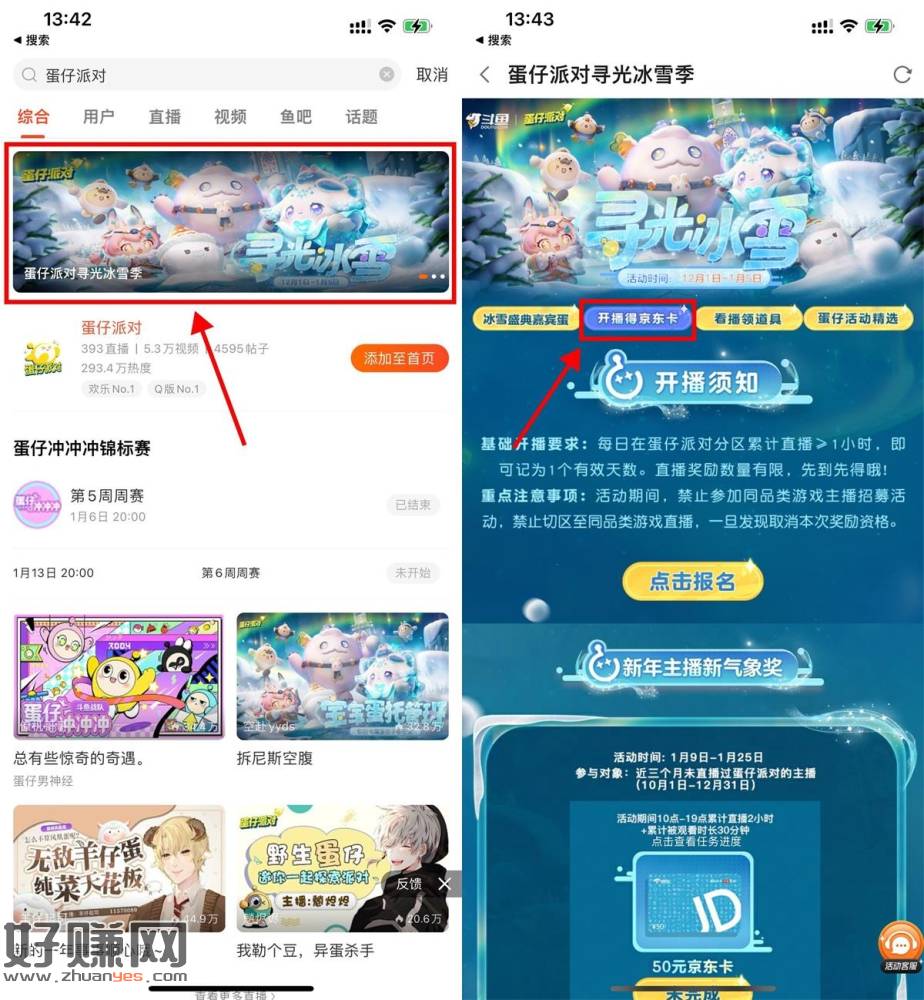 斗鱼APP搜索“蛋仔派对”->横幅“寻光冰雪”->累计直播2小时+被观看时长30分钟即可领50元京东E卡