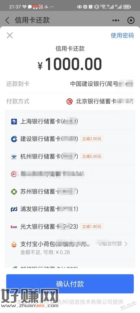 杭州银行满1000减5,试了可以两次,其它银行自测。