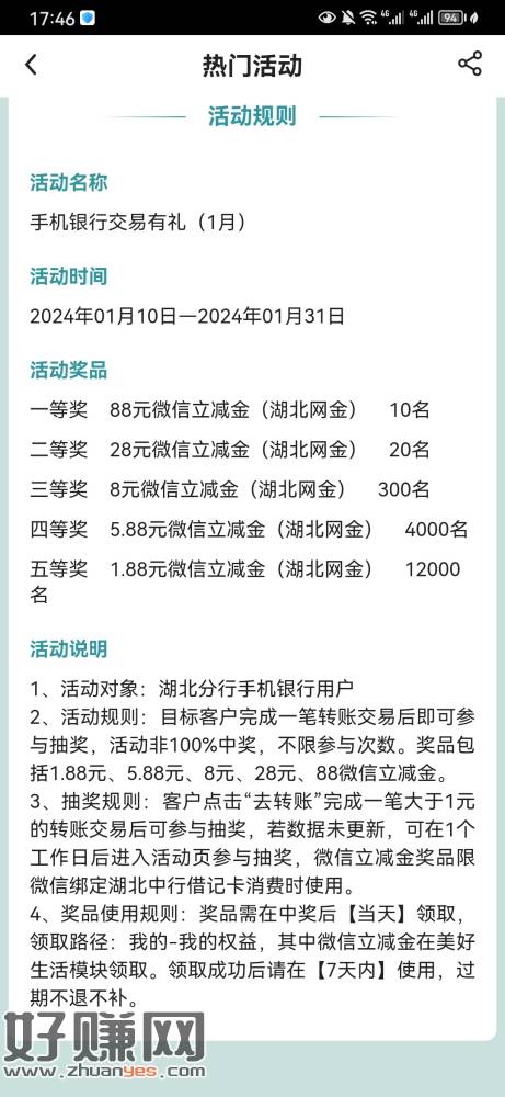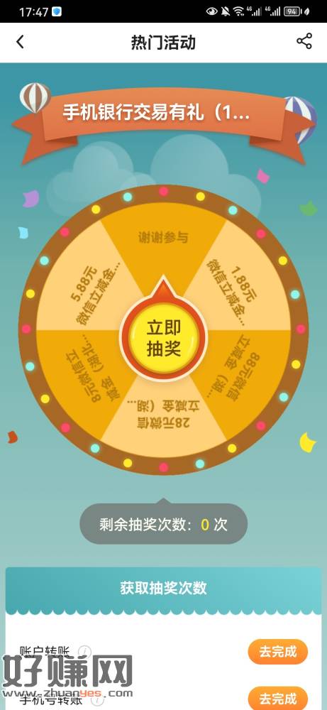 湖北中行,转自己的任意一张银行卡金额>1元就有一次抽奖机会,