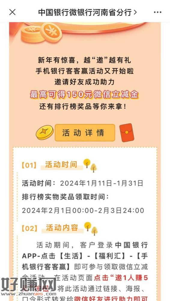 中行河南福利汇手机银行客客赢,好友助力领立减金,河南分行有一