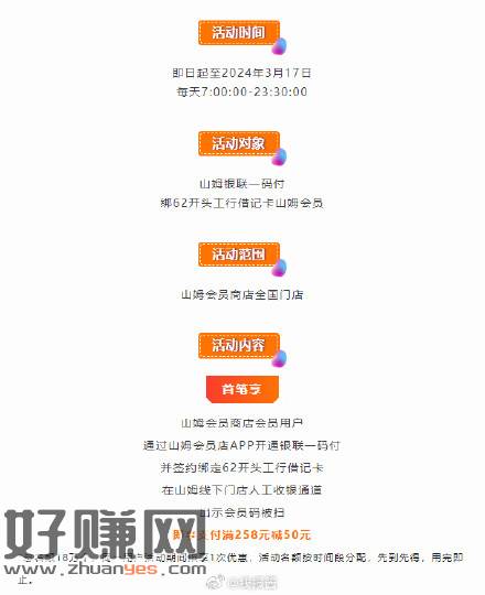山姆一码付绑银联工行借记卡首笔满258元减50元!