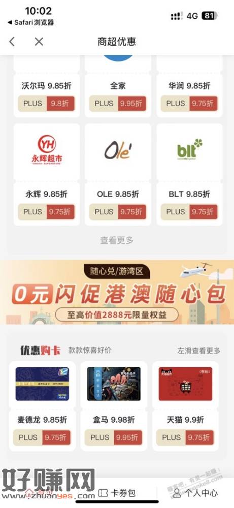 车主卡或其它,上月消费6000,扫图一领3张100-20,找到商超按图二买3张50盒马卡