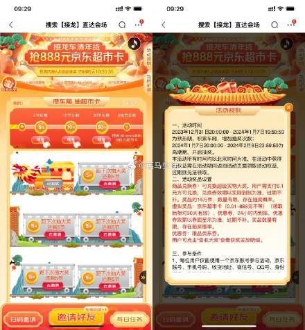 【京东接龙抽0.1~888元超市卡】每日任务或邀请好友得车厢->累计5/10/30节车厢抽5/10/50元京东超市卡