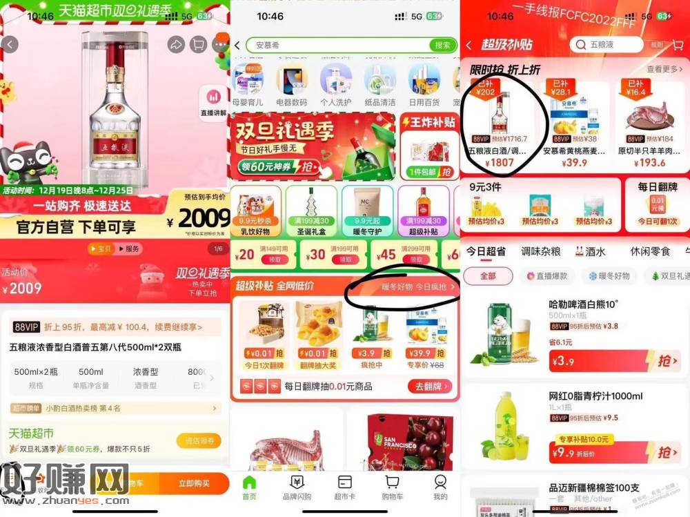 天猫超市中间横幅超级低价 下单五粮液。100来润 行情890一瓶。现在盾少 冲