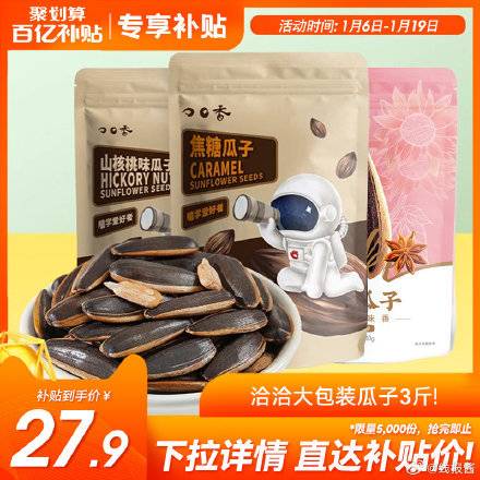 百亿补贴 27.9亓, ,洽洽山核桃瓜子500g*3袋,