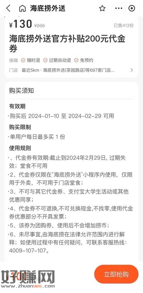 支付宝-消费券-海底捞!100抵200外卖券(部分地区)