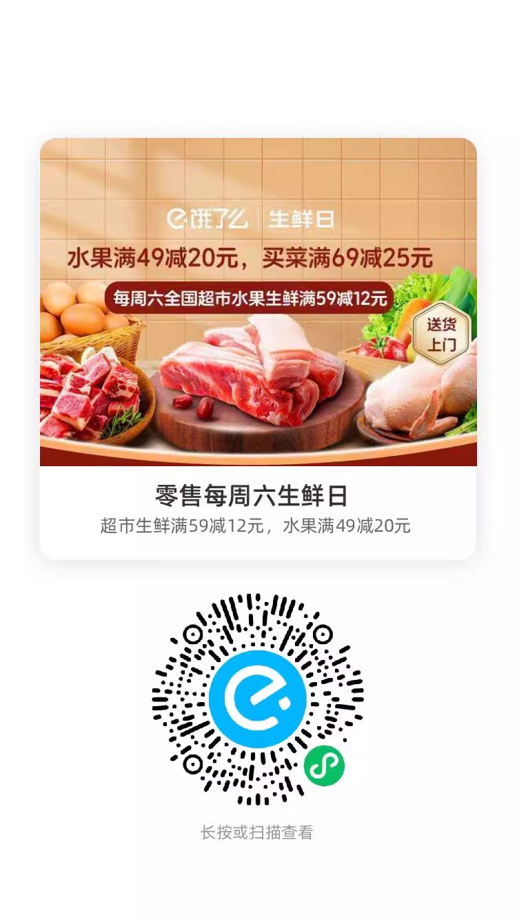 微信扫,饿了么周六买菜有叮咚69-25,水果49-20