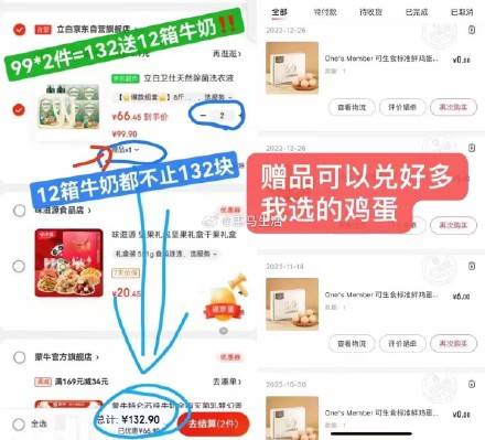 0元撸自营漏价加入购物车现在把数量改成2件共16斤洗衣液,神奇的变132.9元关键还送12箱纯牛奶或者鸡蛋都不止132块了