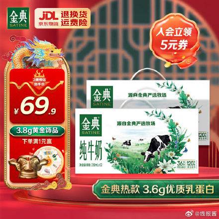 69.9元,金典 纯牛奶 250ml*12盒*2箱