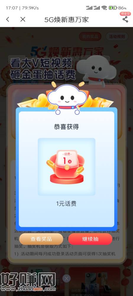 中国电信砸蛋中了1话费,下面浏览加机会。