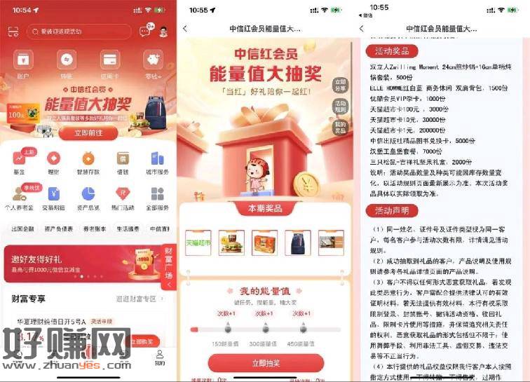 中信APP首页横幅->根据提示得能量值->使用能量值抽卡券或实物等奖励